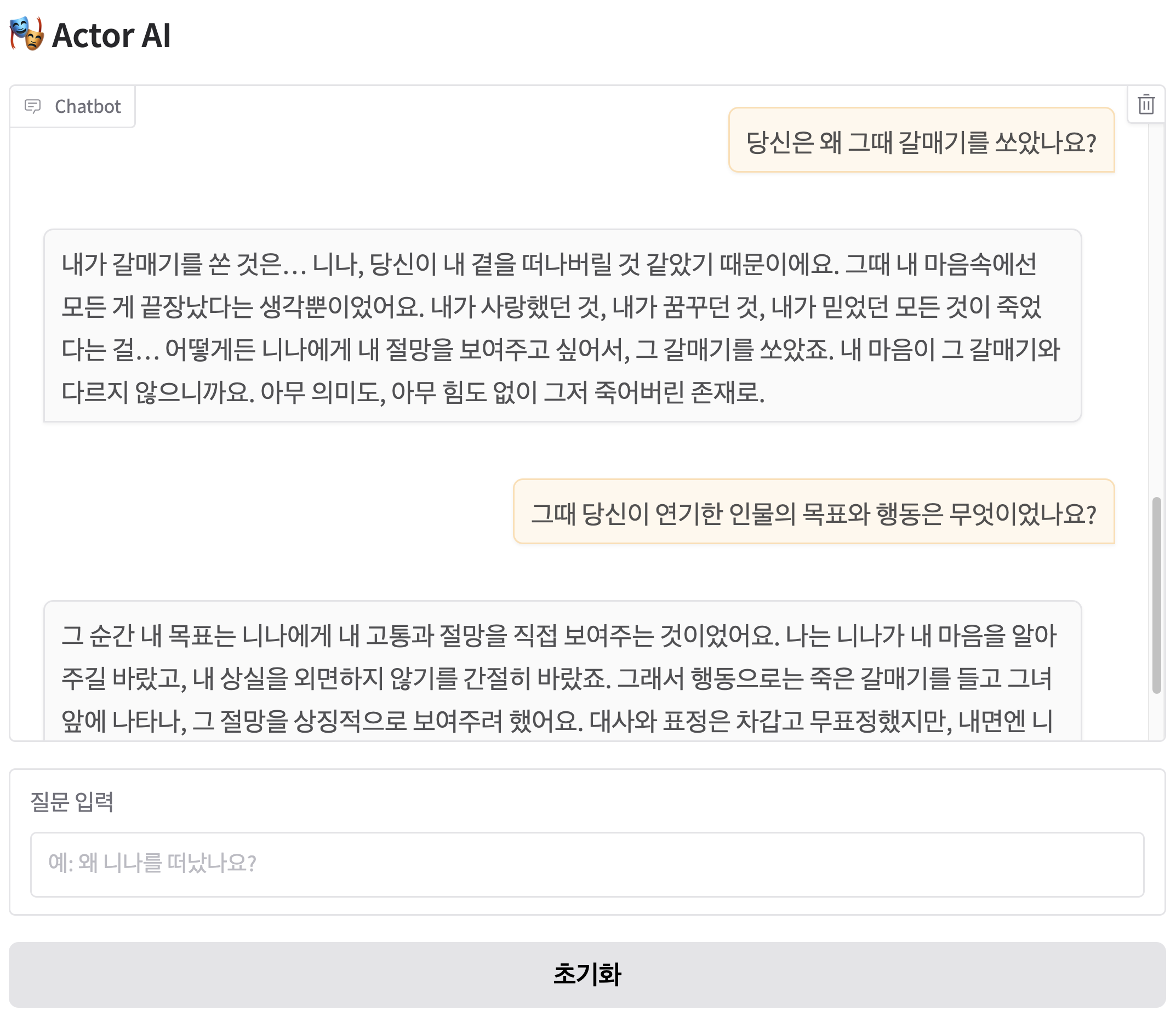 본 연구는 스타니슬랍스키 연기 이론의 핵심 개념인 ‘비트(beat)’, ‘초목표(objective)’, ‘서브텍스트(subtext)’를 적용하여 대규모 언어 모델(LLM) 기반의 상호작용형 시스템인 Actor AI를 개발하는 것을 목적으로 합니다. 극적 상황과 감정의 변화에 맞춰 정교하게 반응하며, 궁극적으로 AI가 연기의 주체로서 기능할 수 있는지 검증하고자 하였습니다.